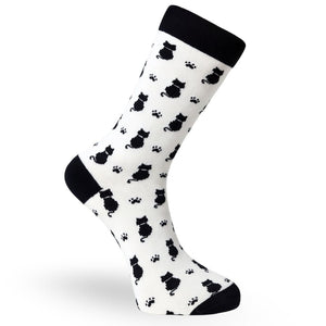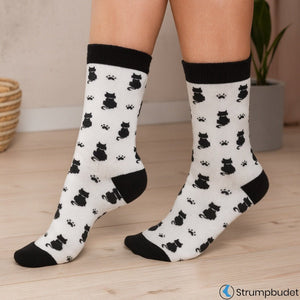 Liva upp vardagen med ett par söta kattstrumpor! Den vita basen pryds av små svarta katter och tassavtryck – en perfekt kombination för alla kattälskare.